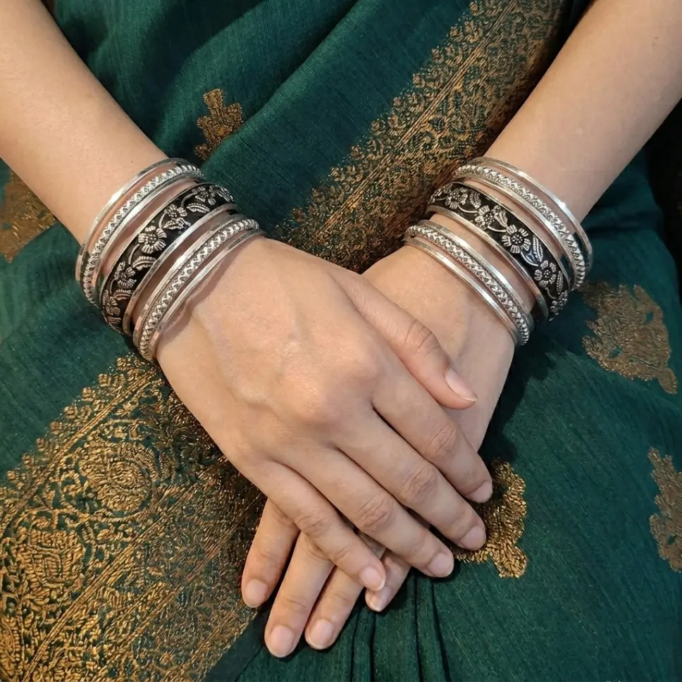 Black floral designed Silver Bangles – 14 Pieces