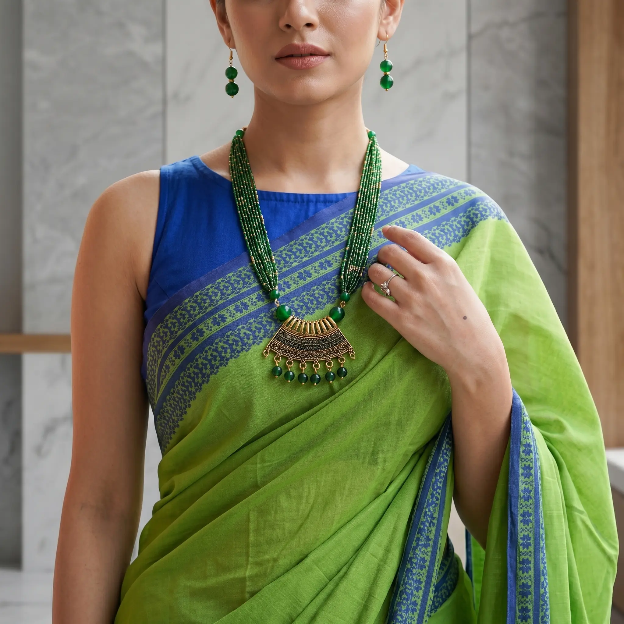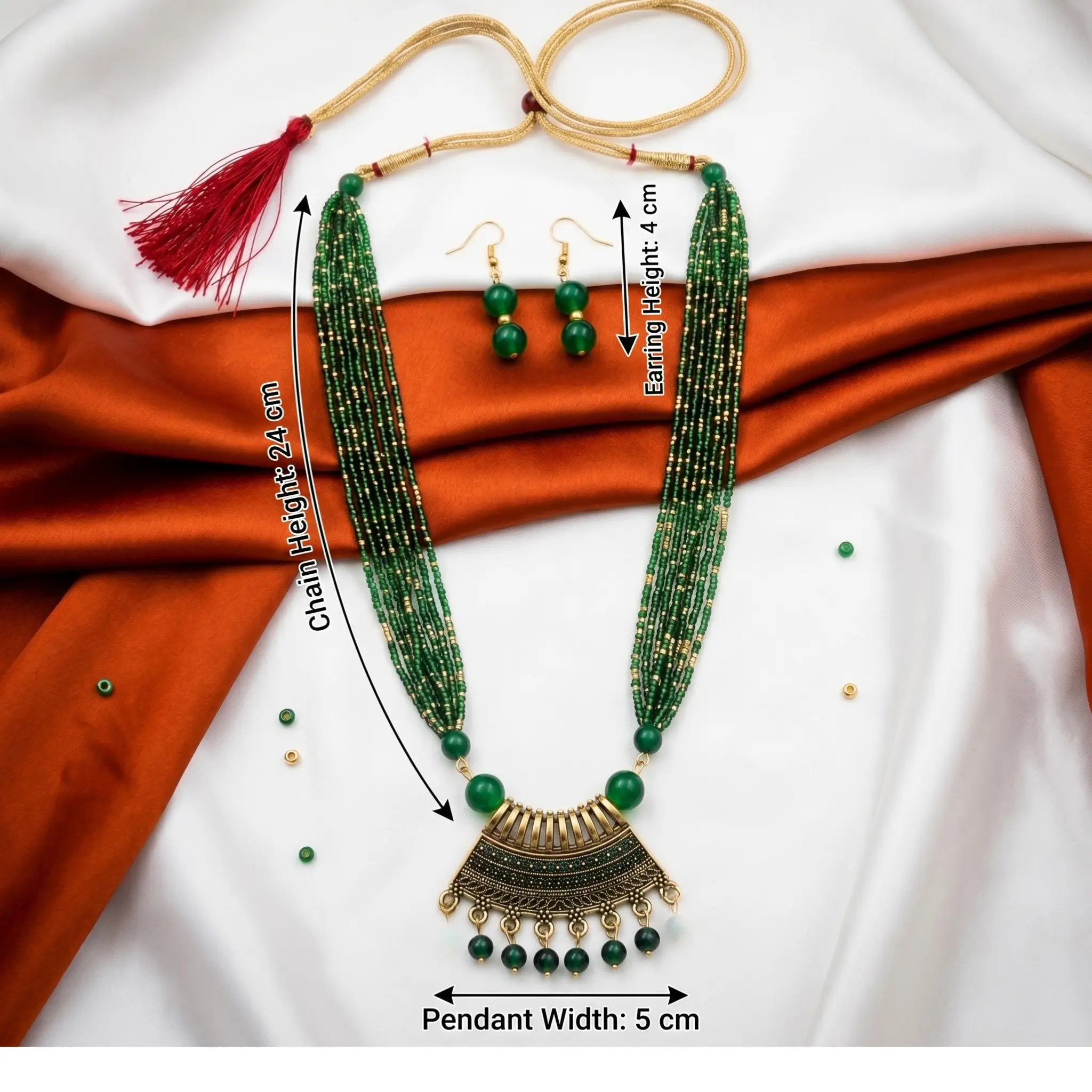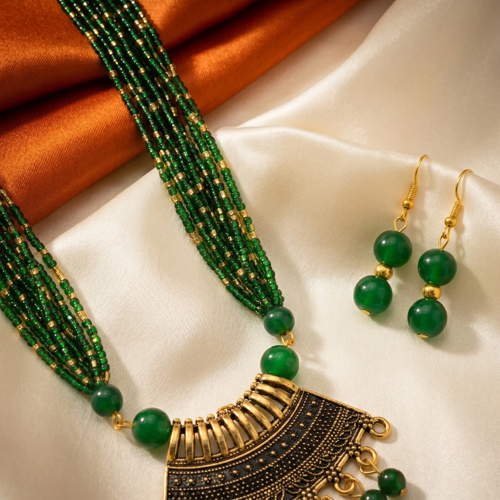 Green and Gold Beads Maal with Earrings