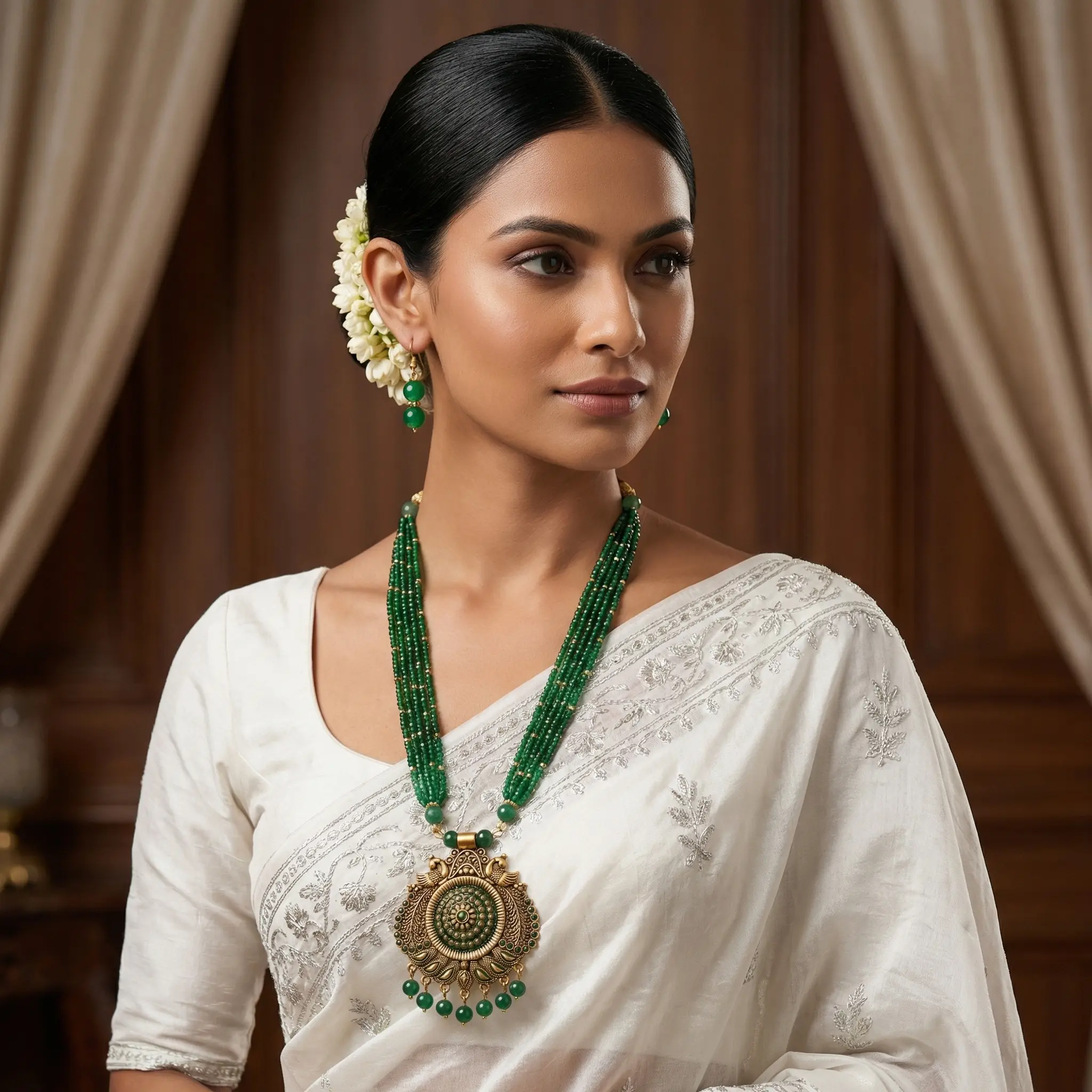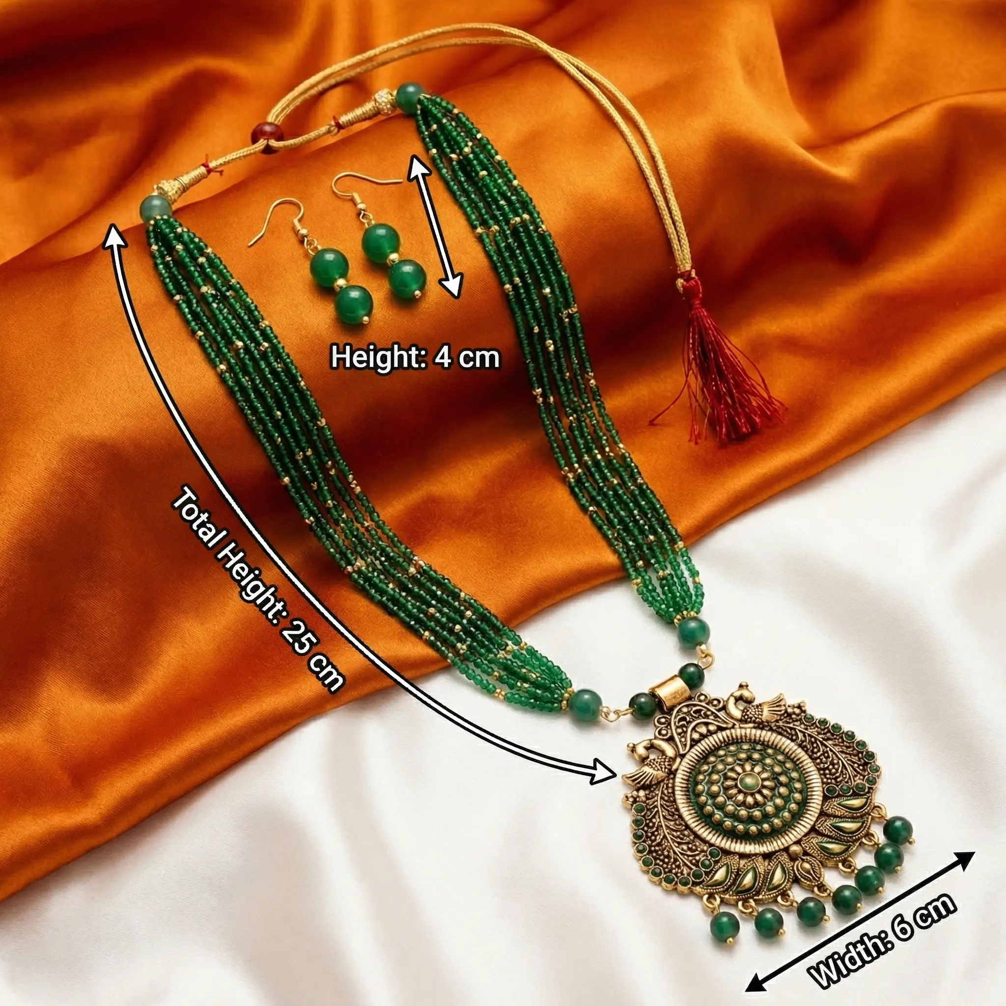 Green and Gold Beads Maal with Earrings
