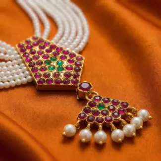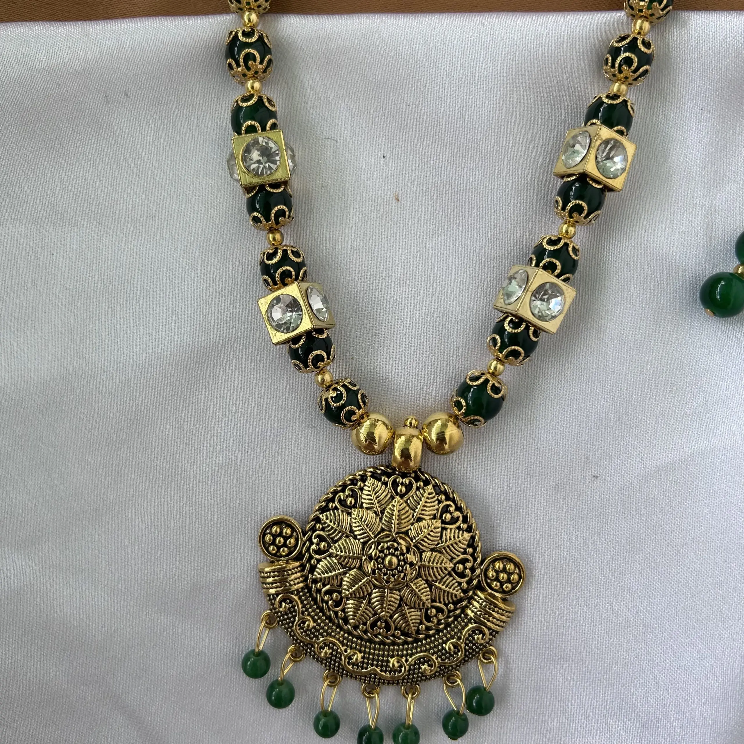 Green and Gold Beads Mala and Earrings