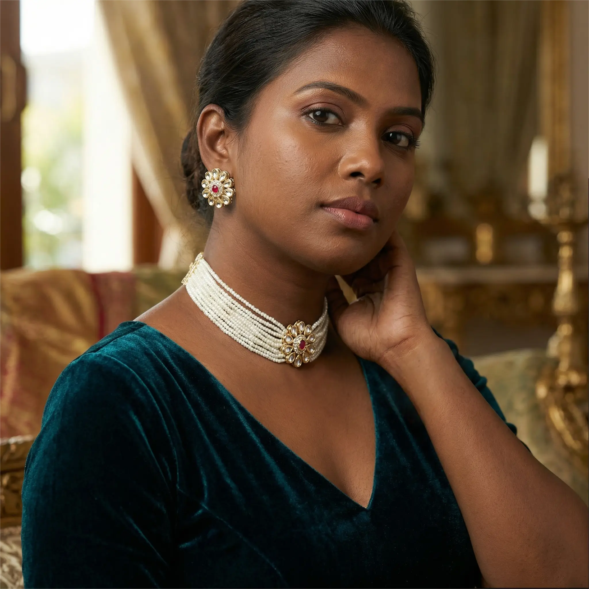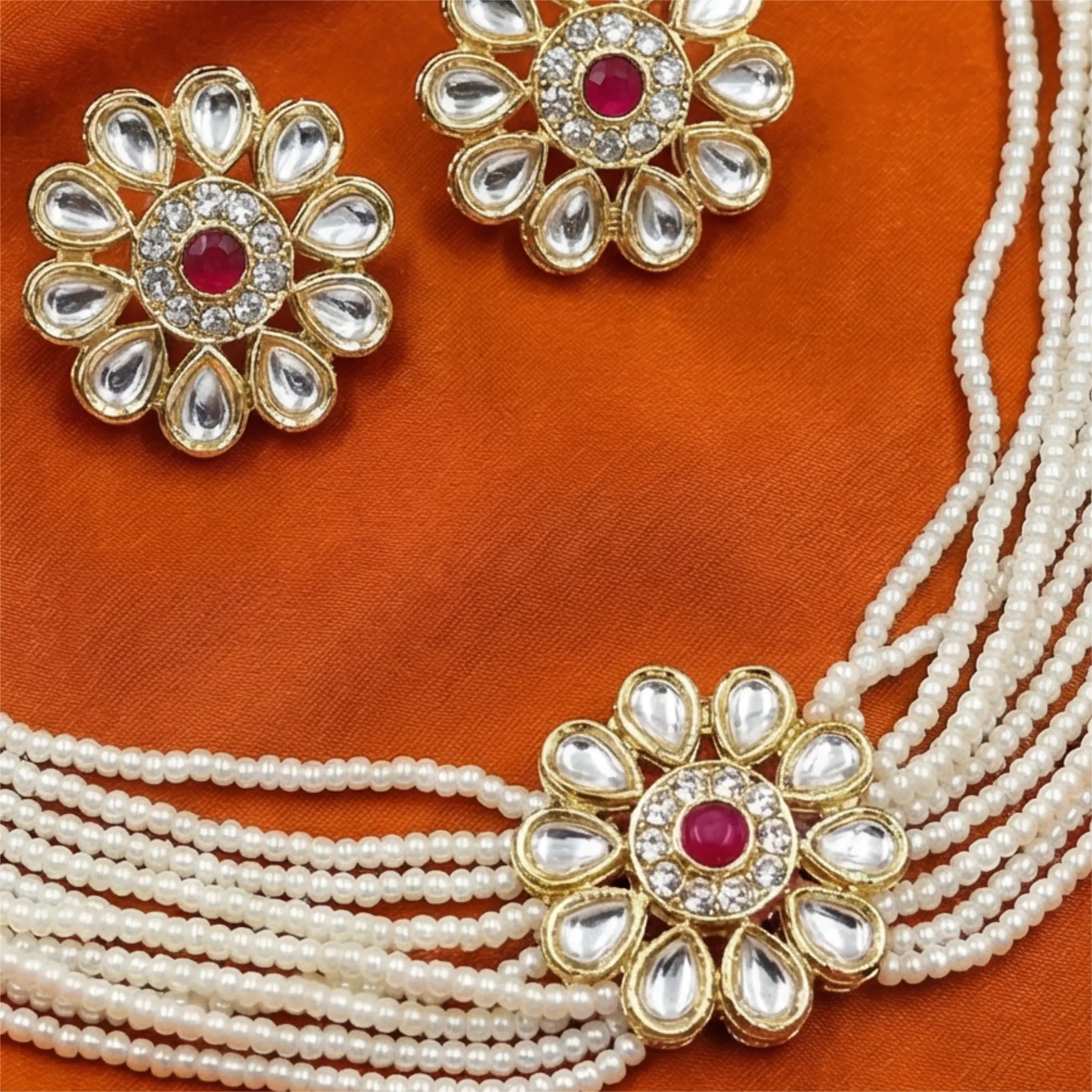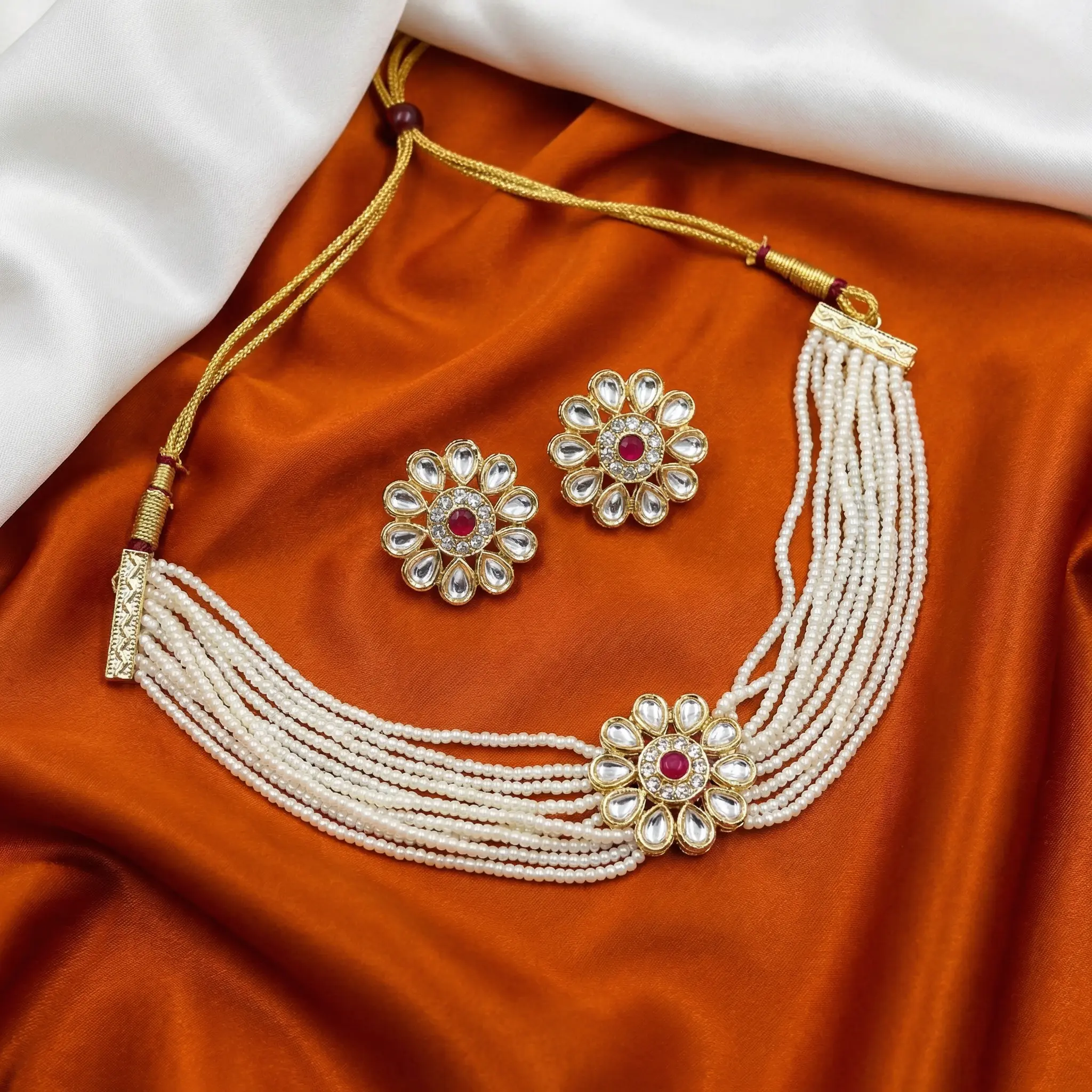 Multi-layer White Beads Choker with Earrings – Pink stone
