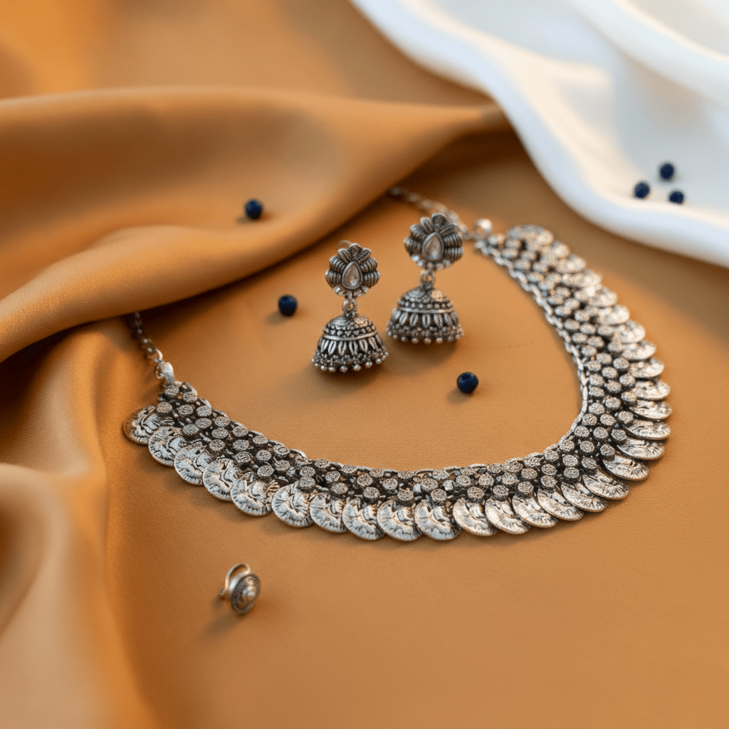 Oxidized Necklace and Jhumka with Free Nose pin