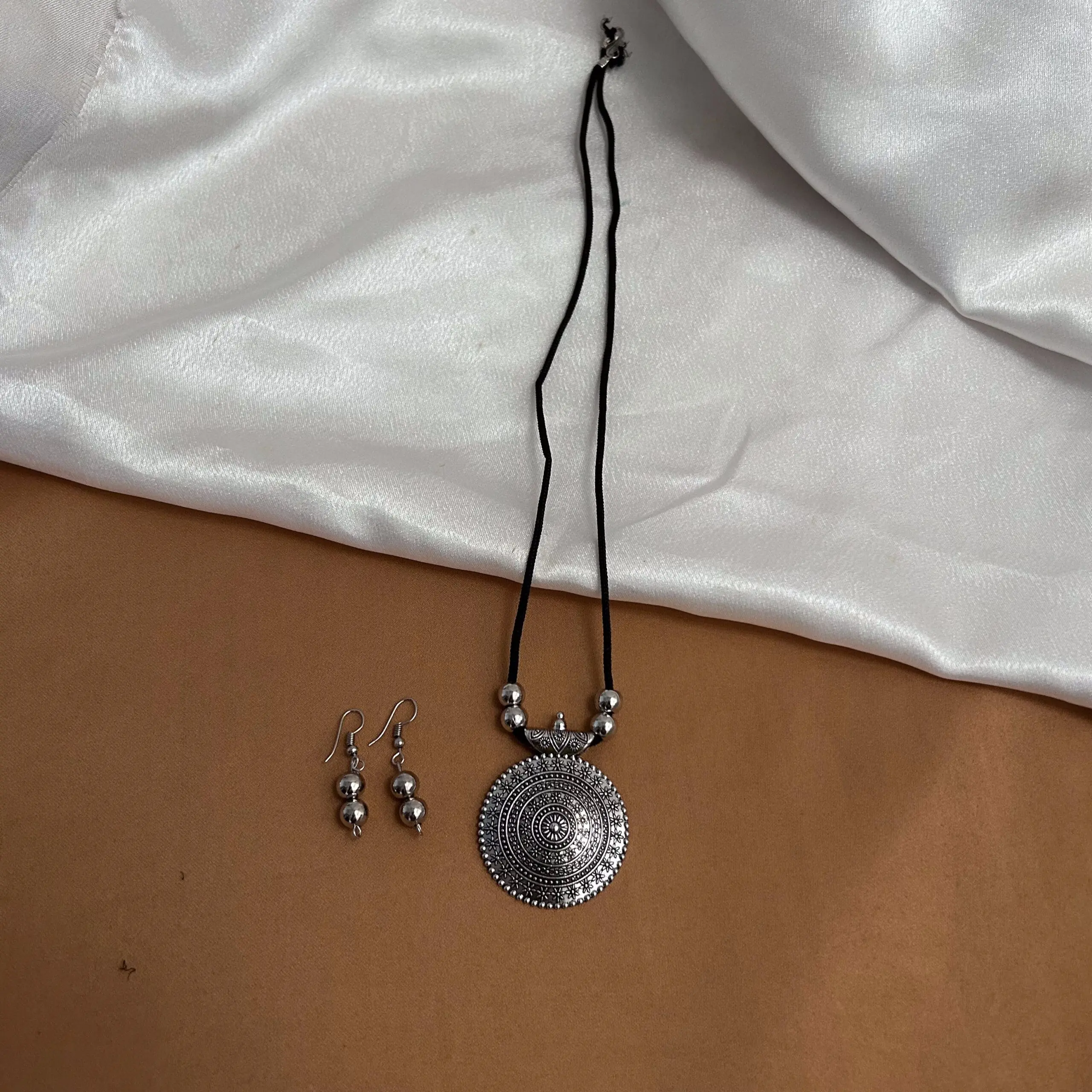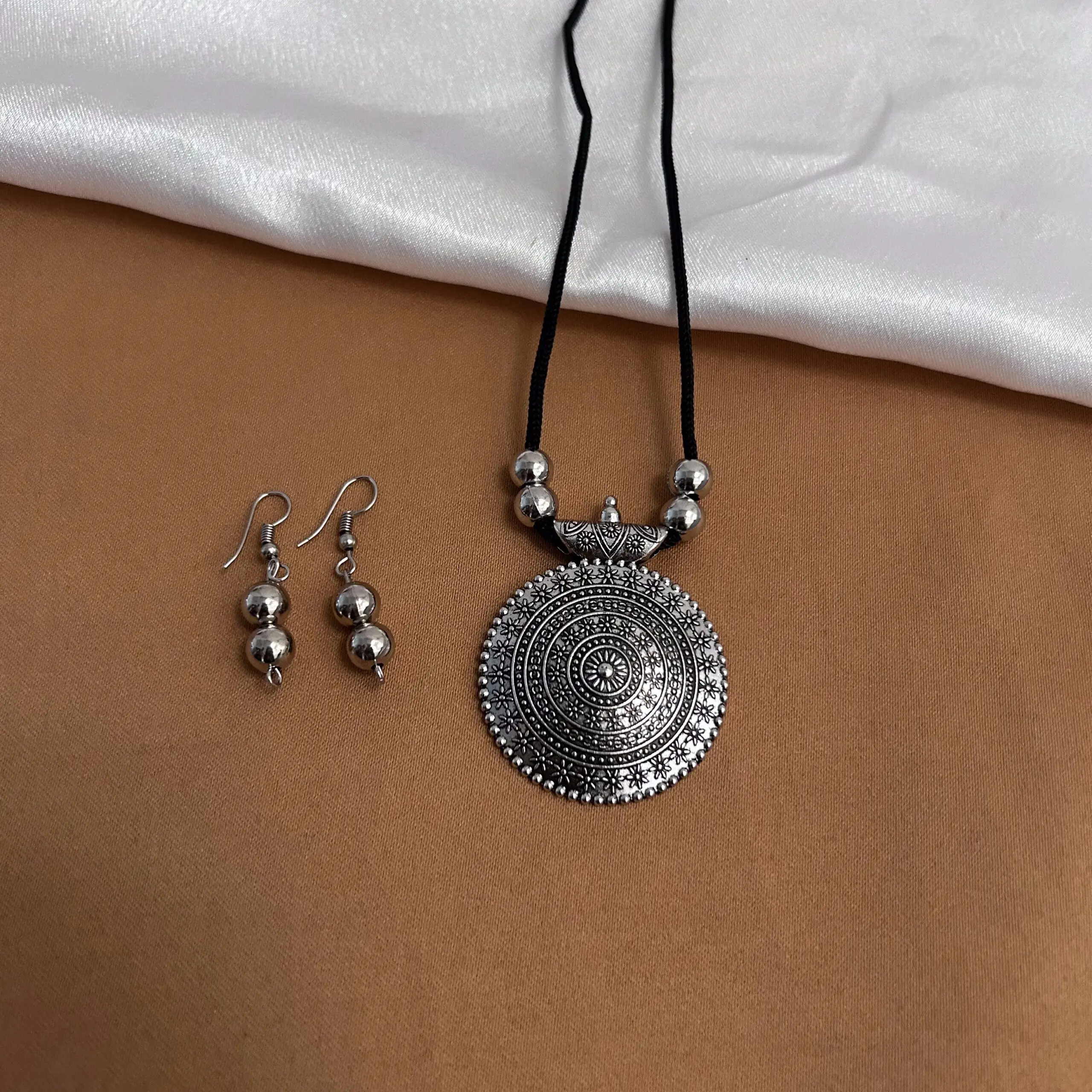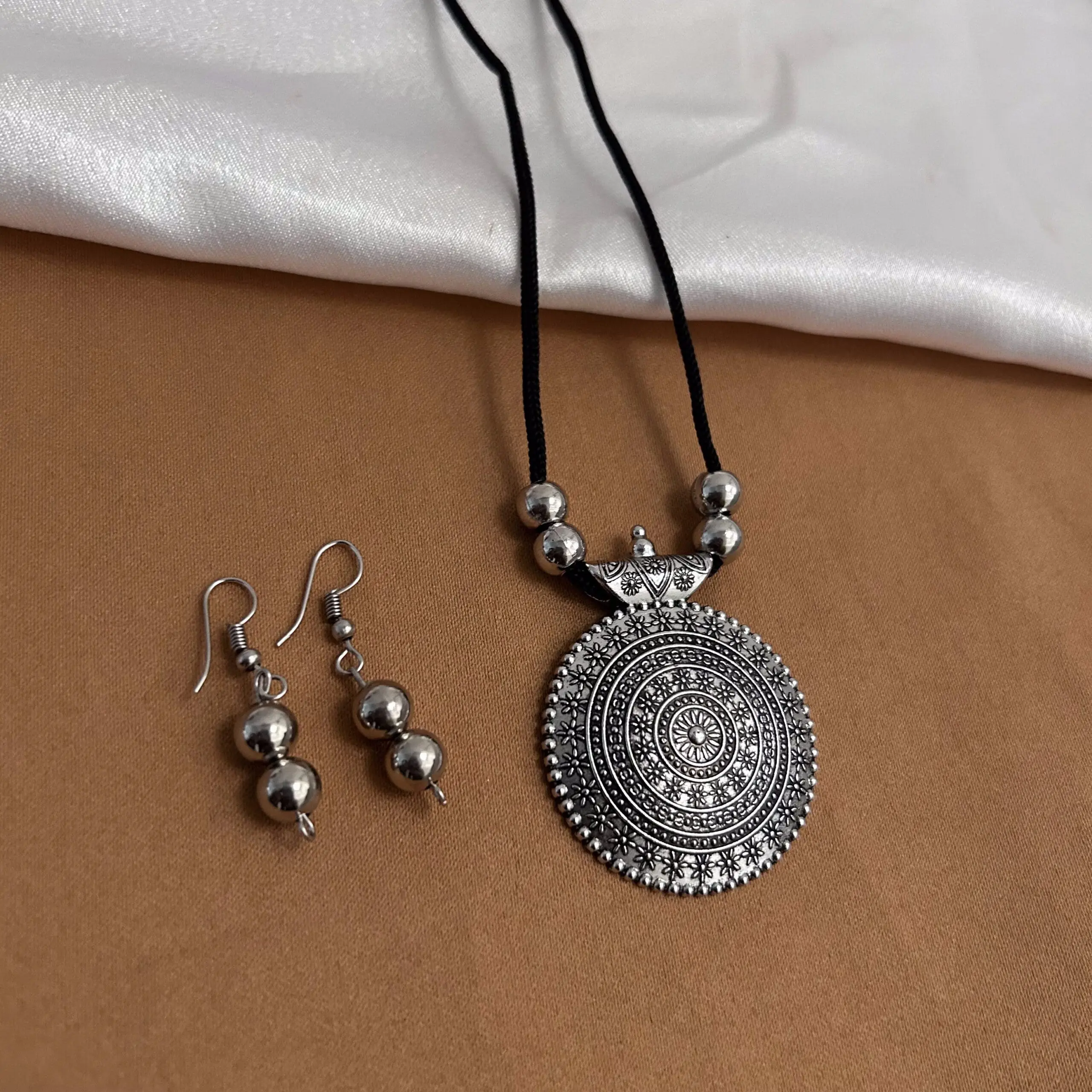 Pendant Shaped Maala with Black Thread & Earrings