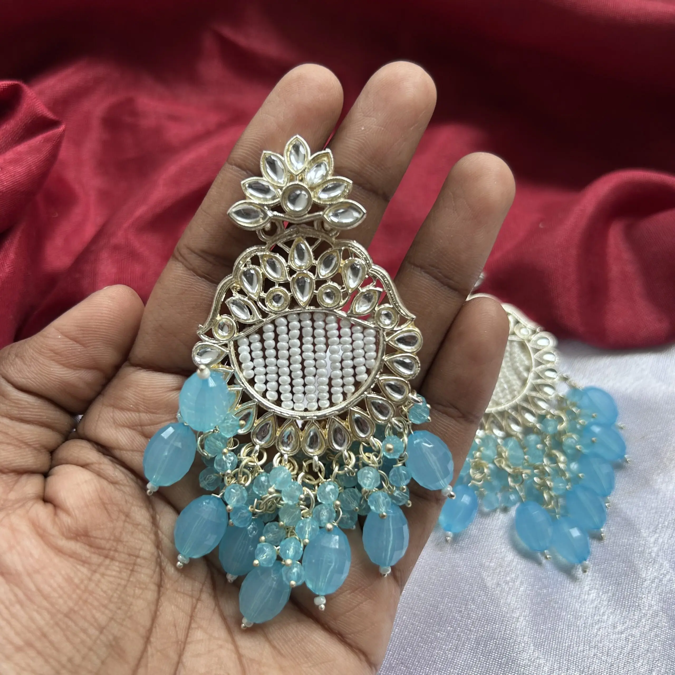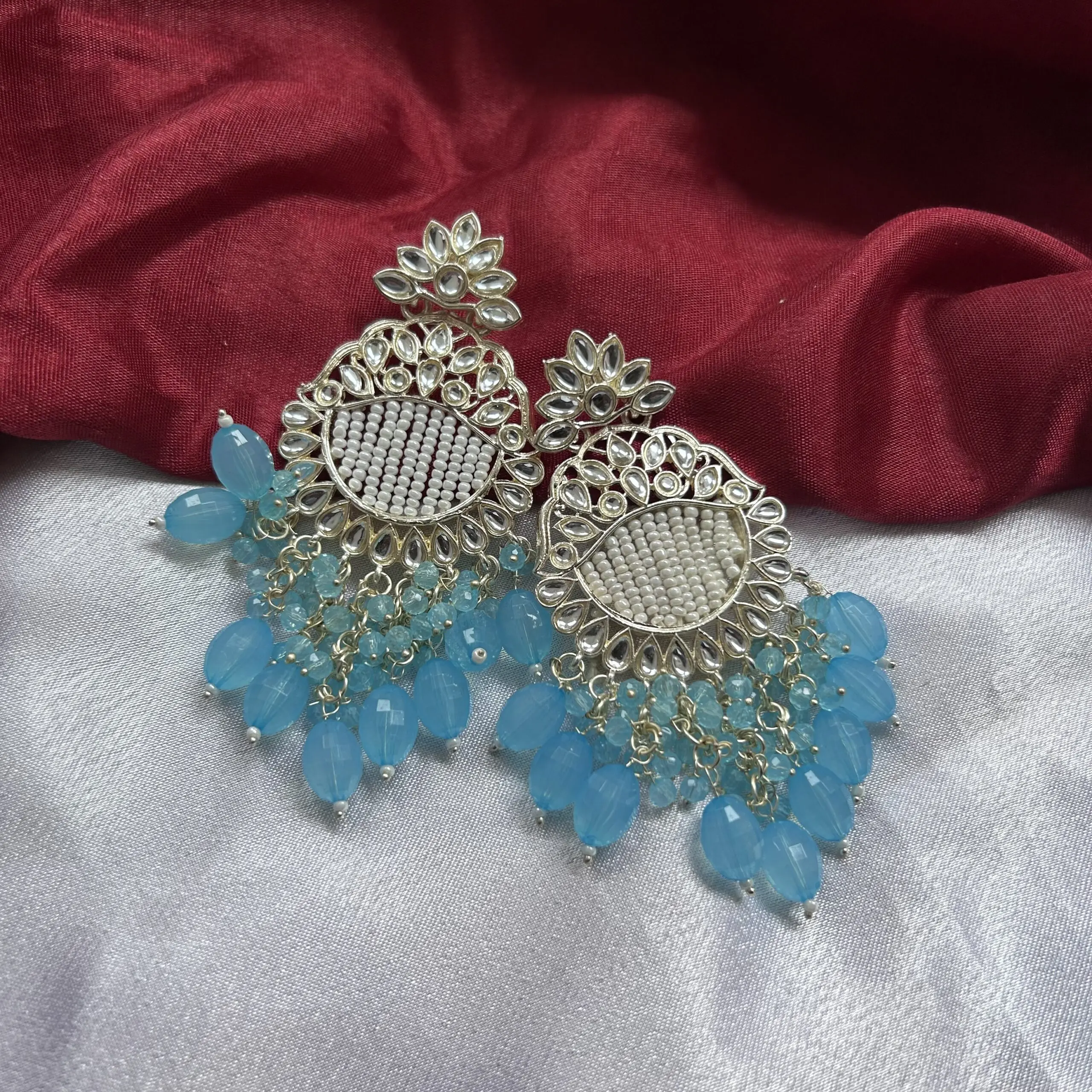 Sky Blue Beaded Kundan Chandelier Earrings