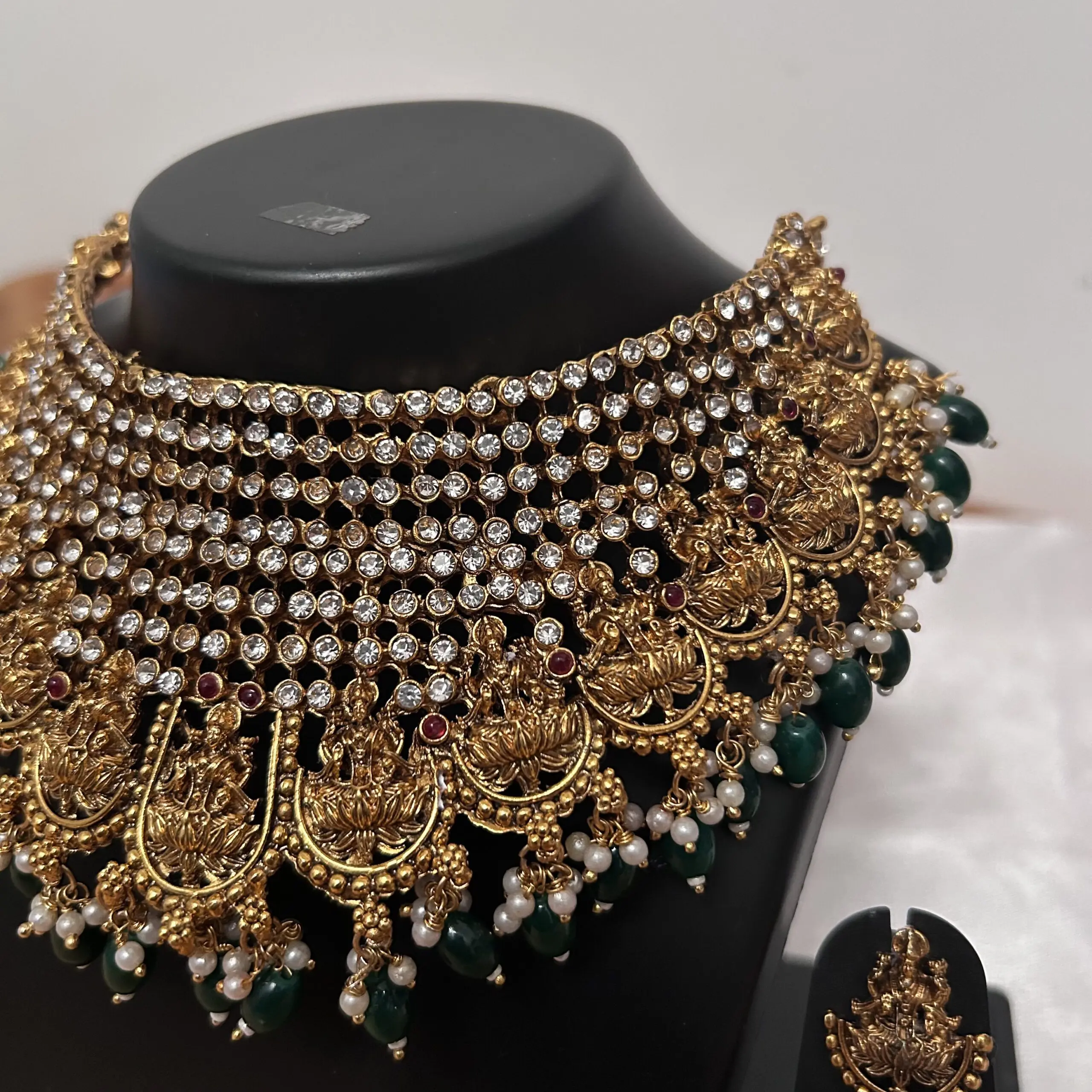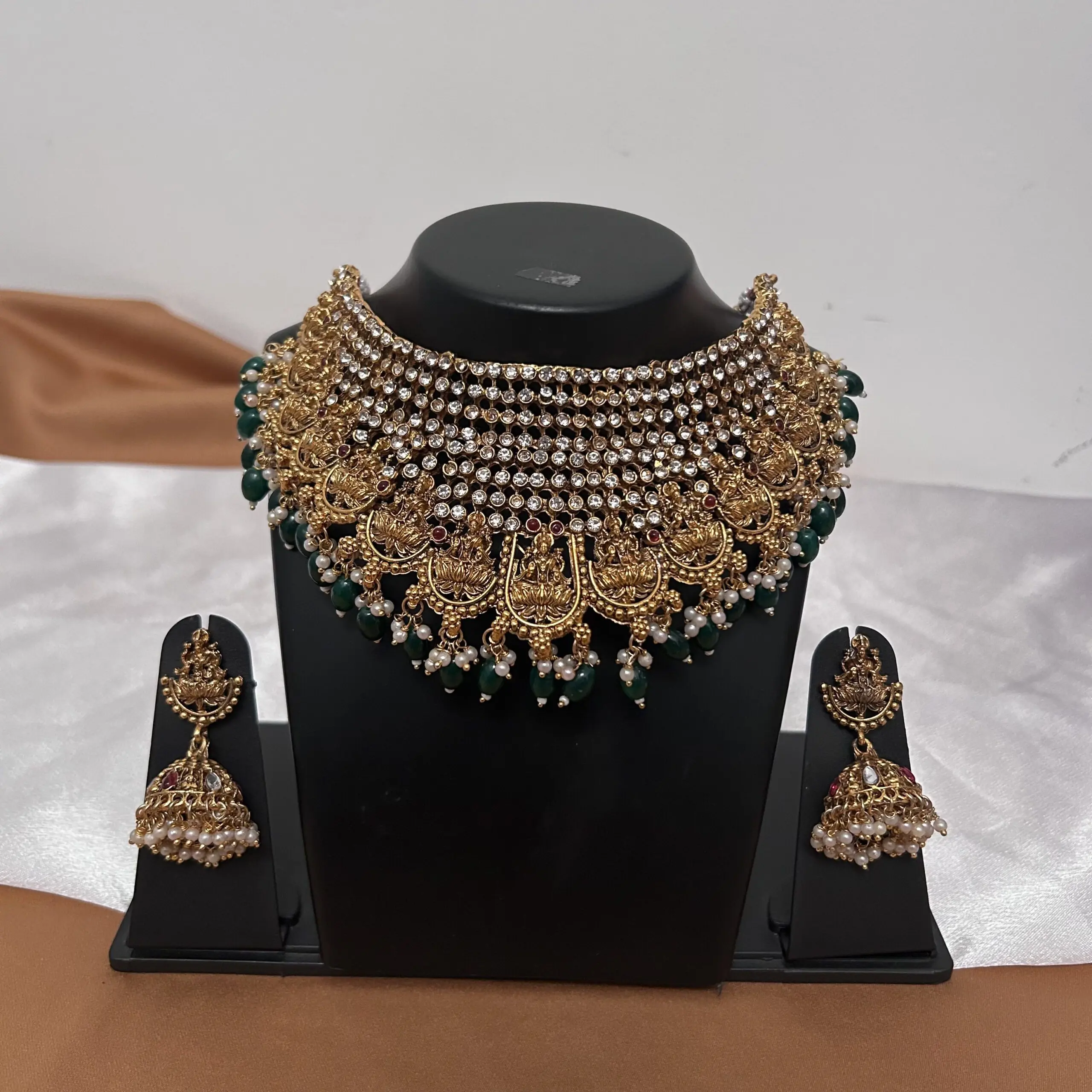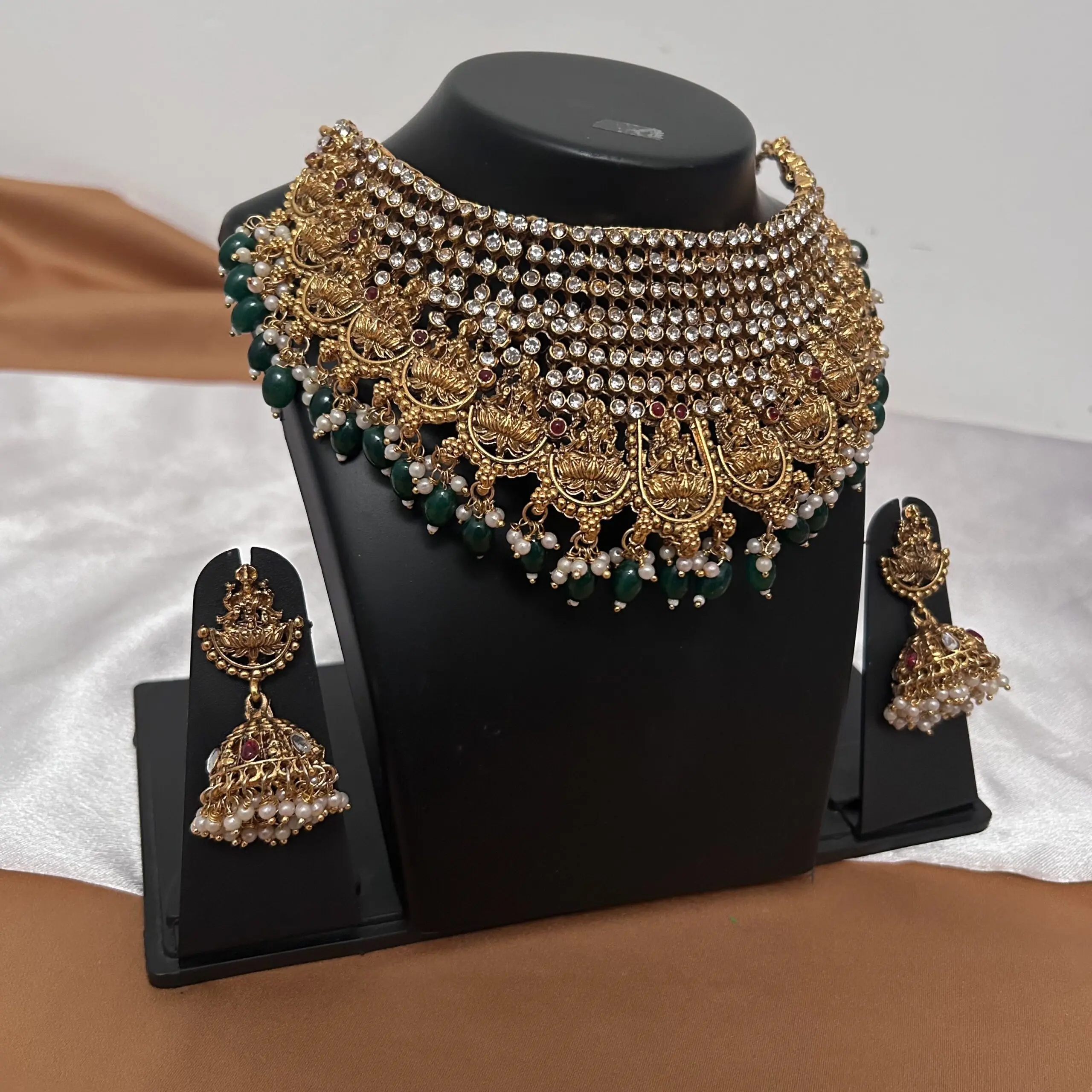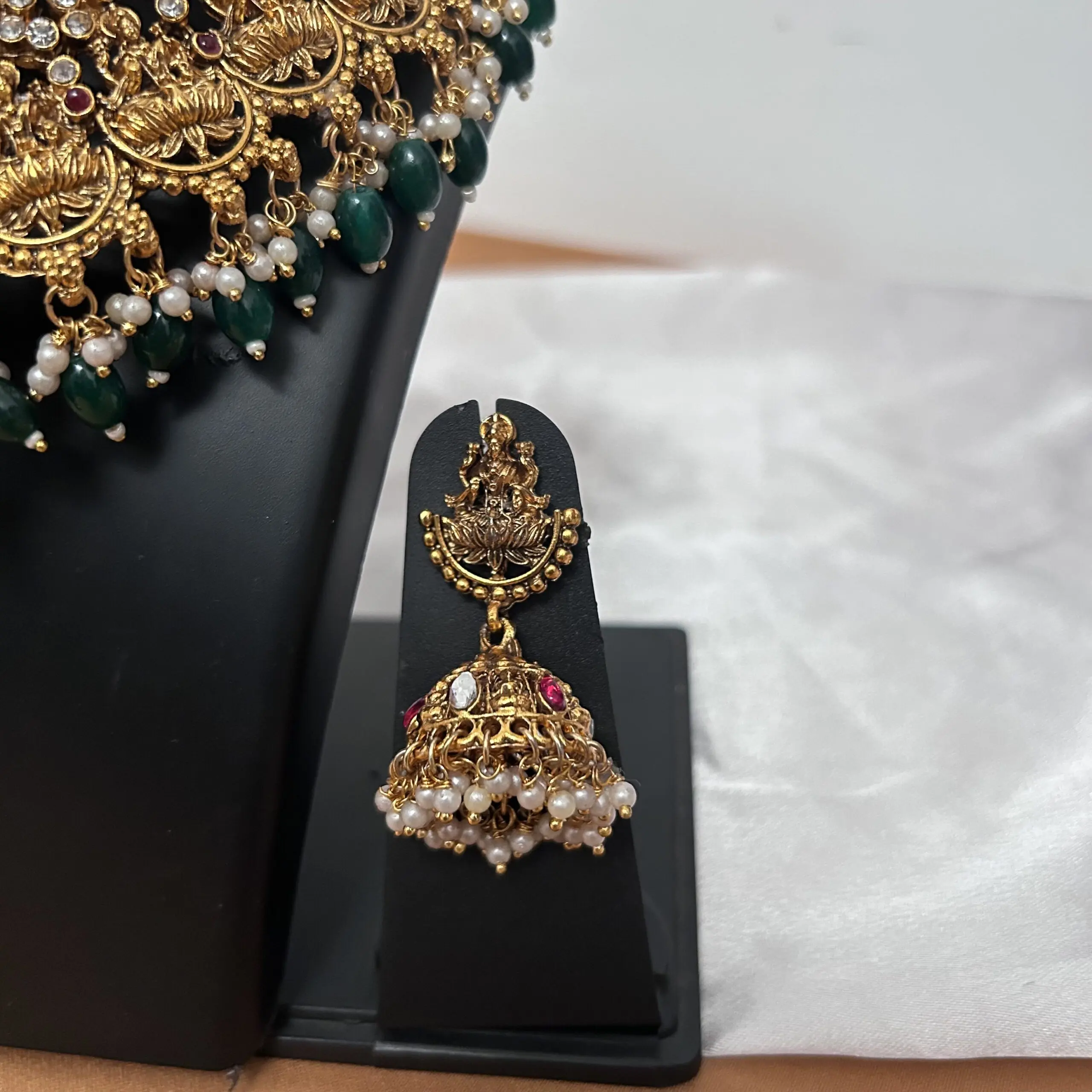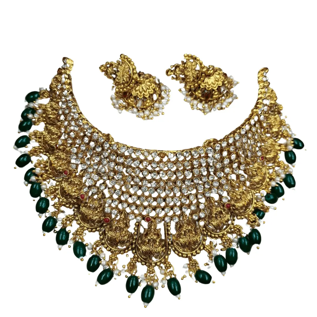 Stone with Green beads Temple Necklace and jhumka