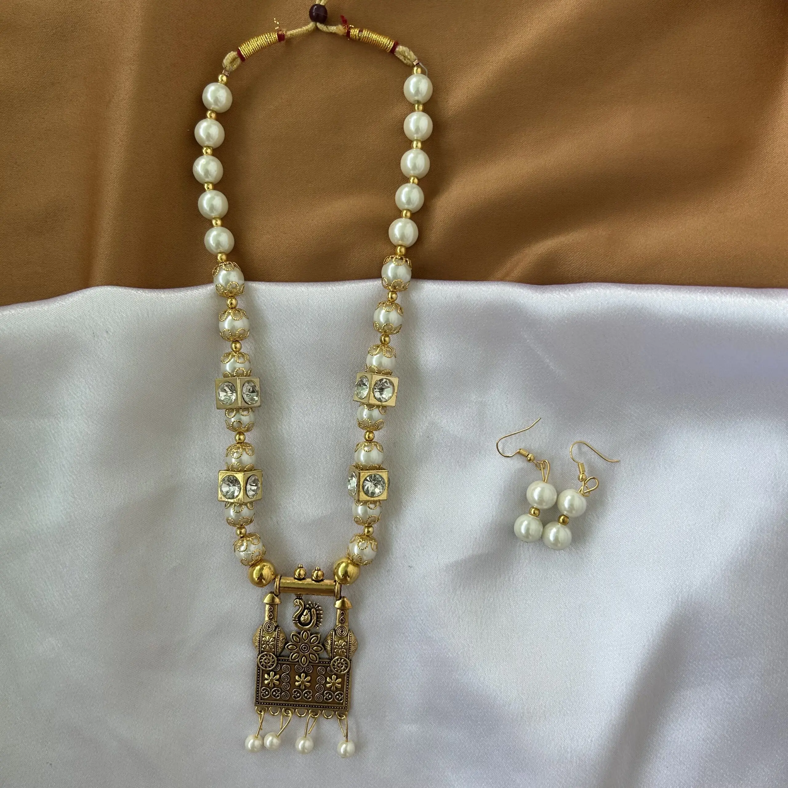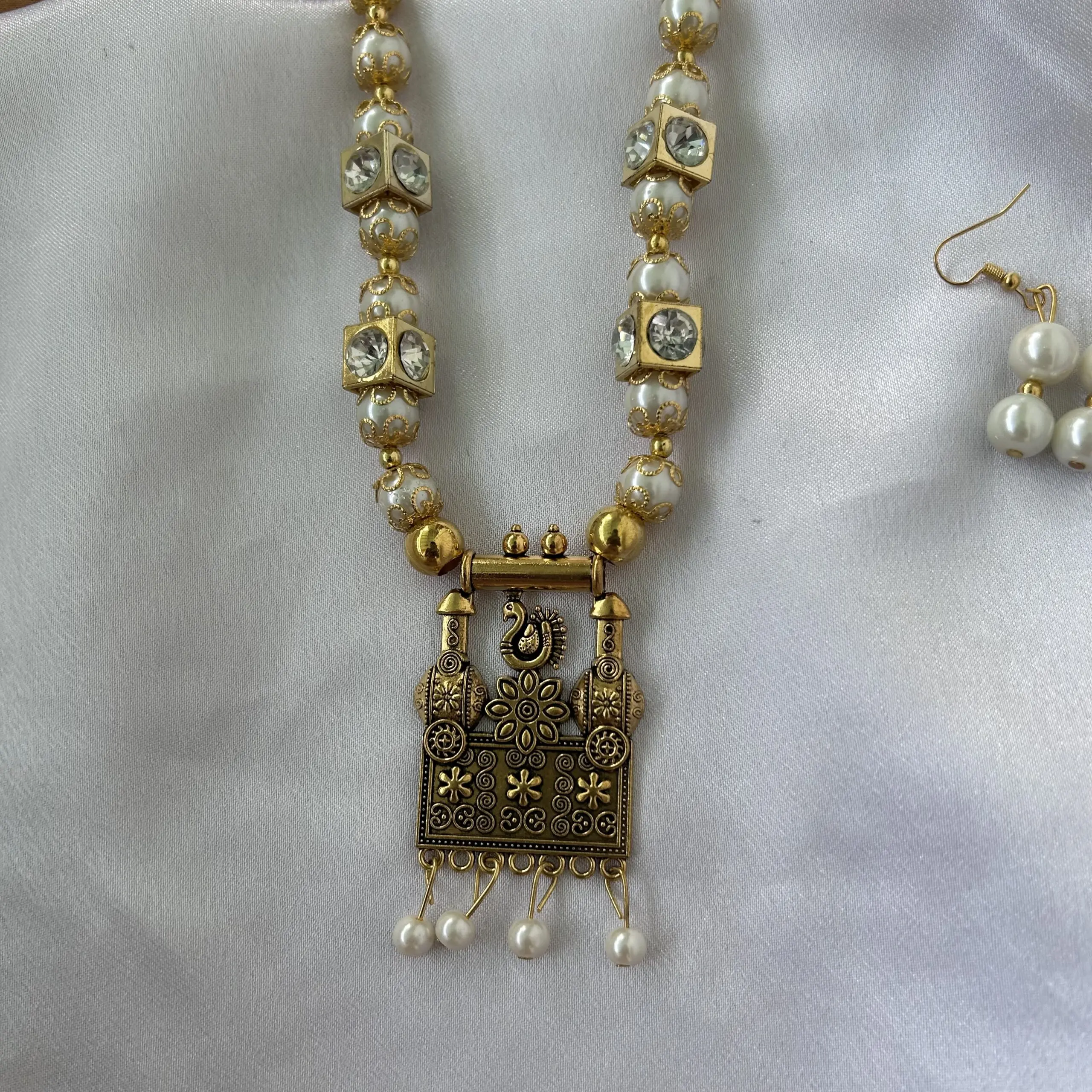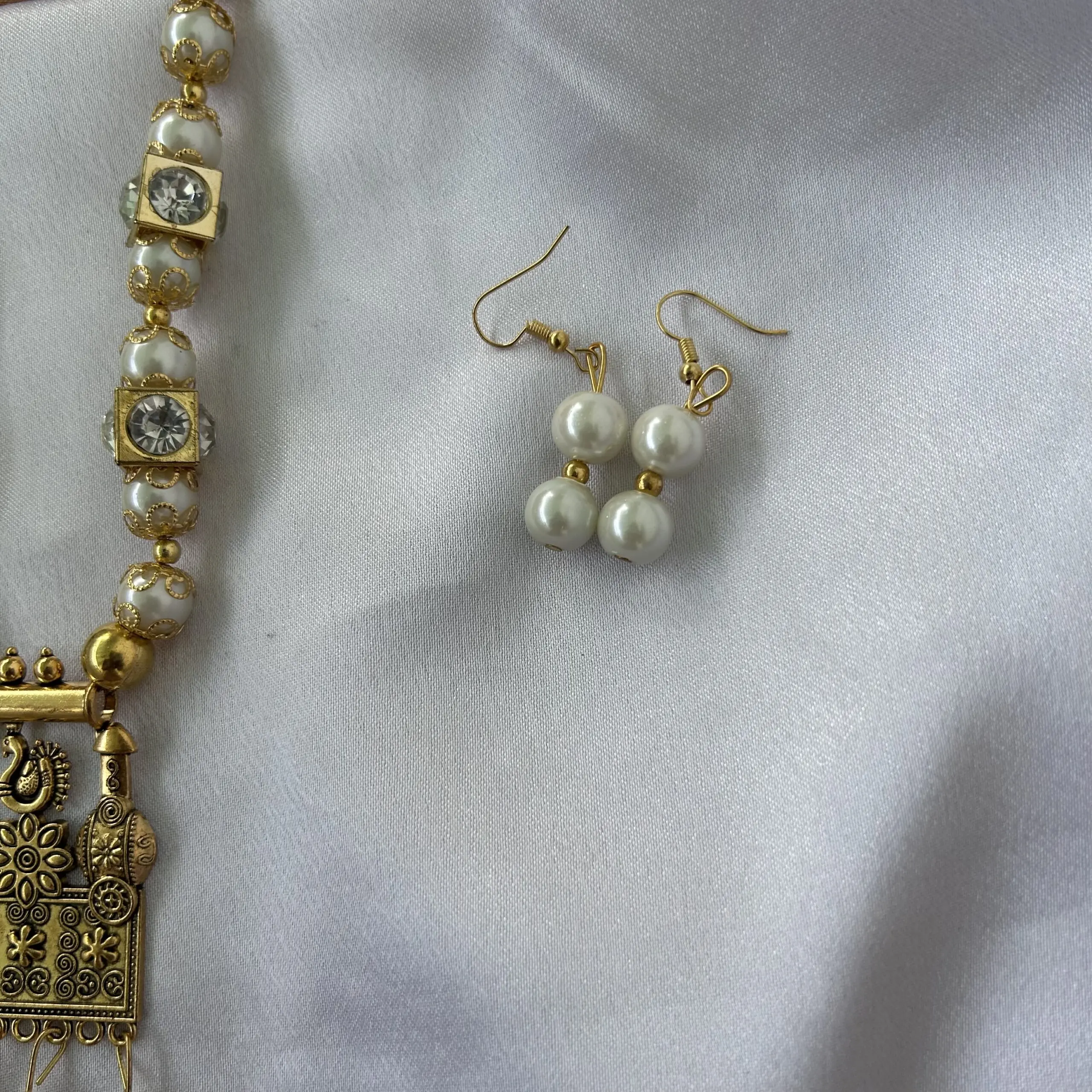 White and Gold Beads Mala and Earrings